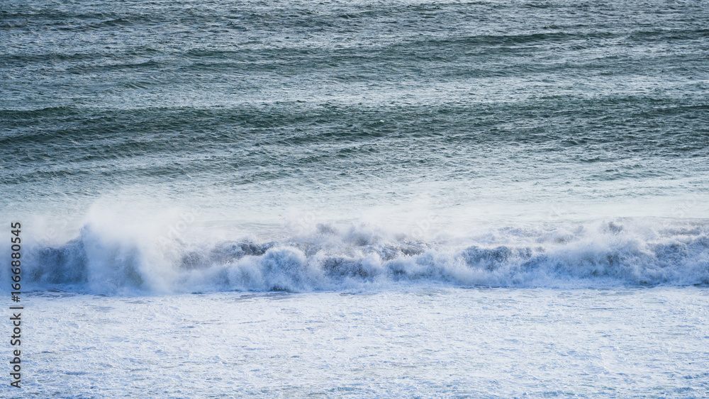 Powerful ocean waves crashing with white foam and sea spray creating dramatic seascape and water texture background