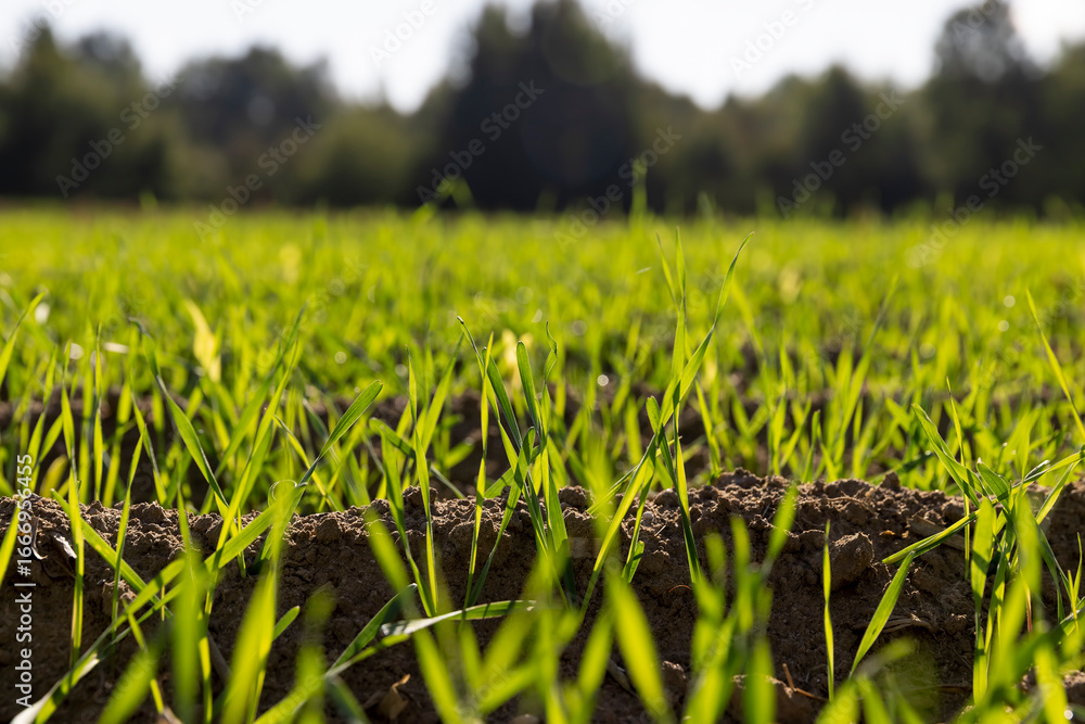 green shoots of frost-resistant wheat that was planted in winter, beautiful winter wheat, cereals in the autumn season before frost, sunny weather