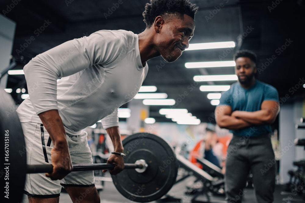 Determined male athlete lifting weights while personal trainer supervises in gym