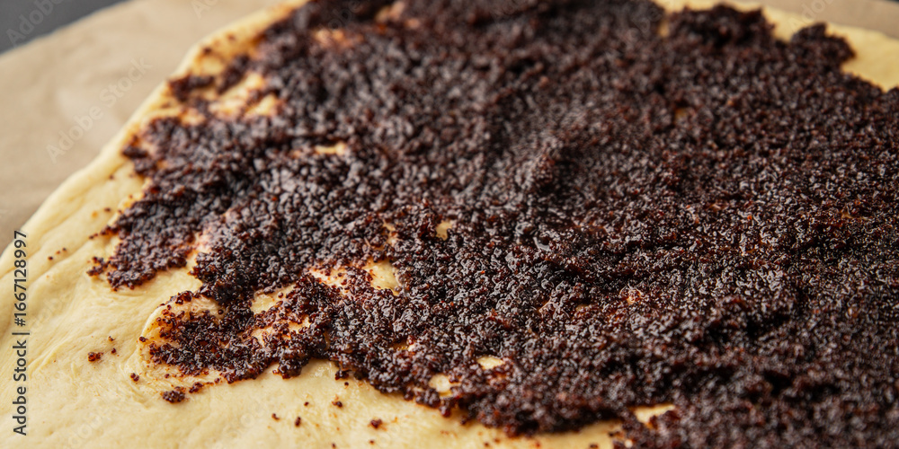 Raw poppy seed buns raw pastry dough baking sweet dessert tasty snack fresh delicious gourmet food background on the table rustic top view copy space