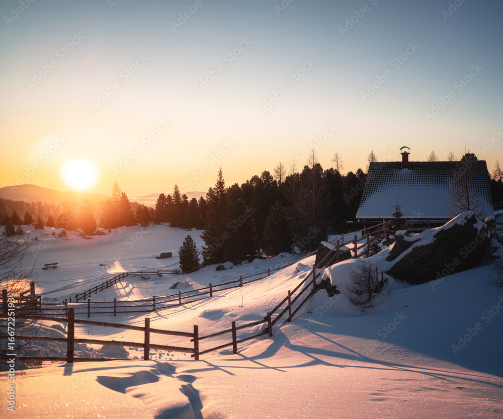 Alpine wooden chalet at sunset in snowy Falkertsee, Austria