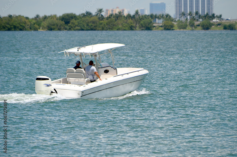 Sport fishing boat on the Intracoastal Waterway near Miami Beach .