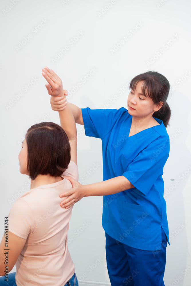 Young Asian nurse assisting middle-aged female patient on a couch doing physical therapy, focusing on muscle strengthening, rehabilitation, stretching,shoulder pain management in healthcare facility