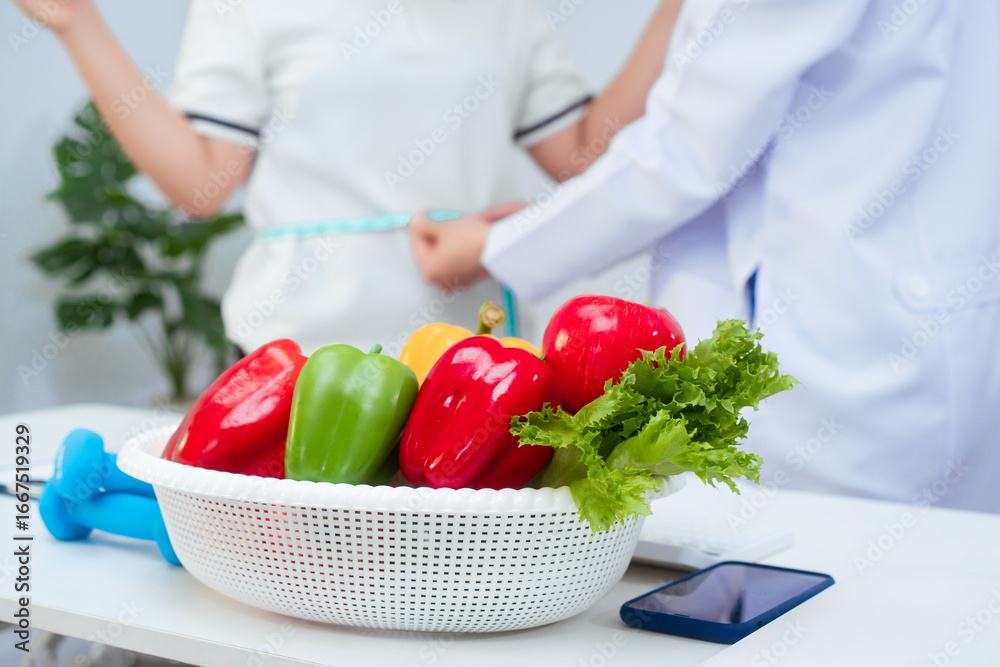 A middle-aged Asian female dietitian conducts a health consultation with a middle-aged Asian female patient at a table, focusing on weight loss, waist measurement, BMI, diet control,overall wellness