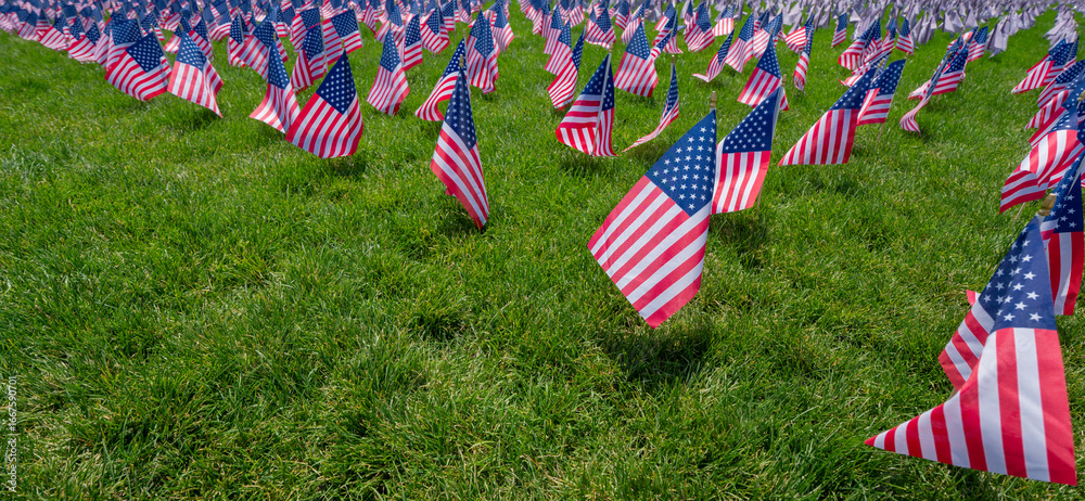 USS flag background. American flag waving. Celebration on 4th of July. Independence Day. American flags on grass. US banner. Memorial Day. USA flags. United States flags in park.