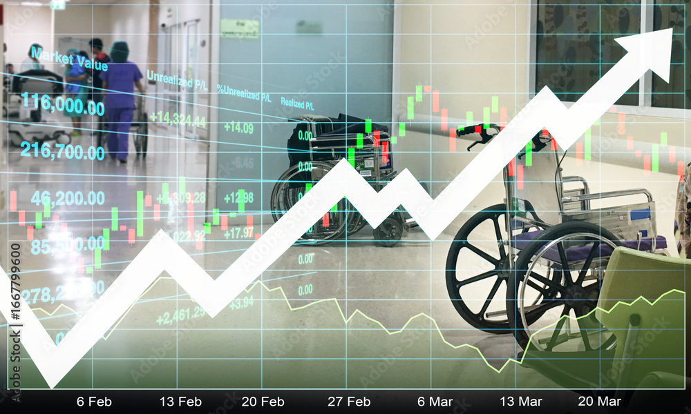 Stock financial index show successful investment on healthcare business and hospital industry with graph, chart and candlesticks data symbol on interior of hospital background.