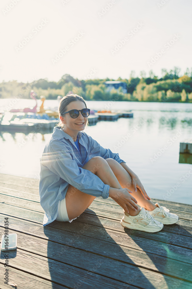 A Bright and Sunny Day at the Beautiful Lake A Woman Reveling in a Peaceful and Relaxing Afternoon by the Serene Water, Indulging in Leisurely Activities and Enjoying Her Time by the Dock