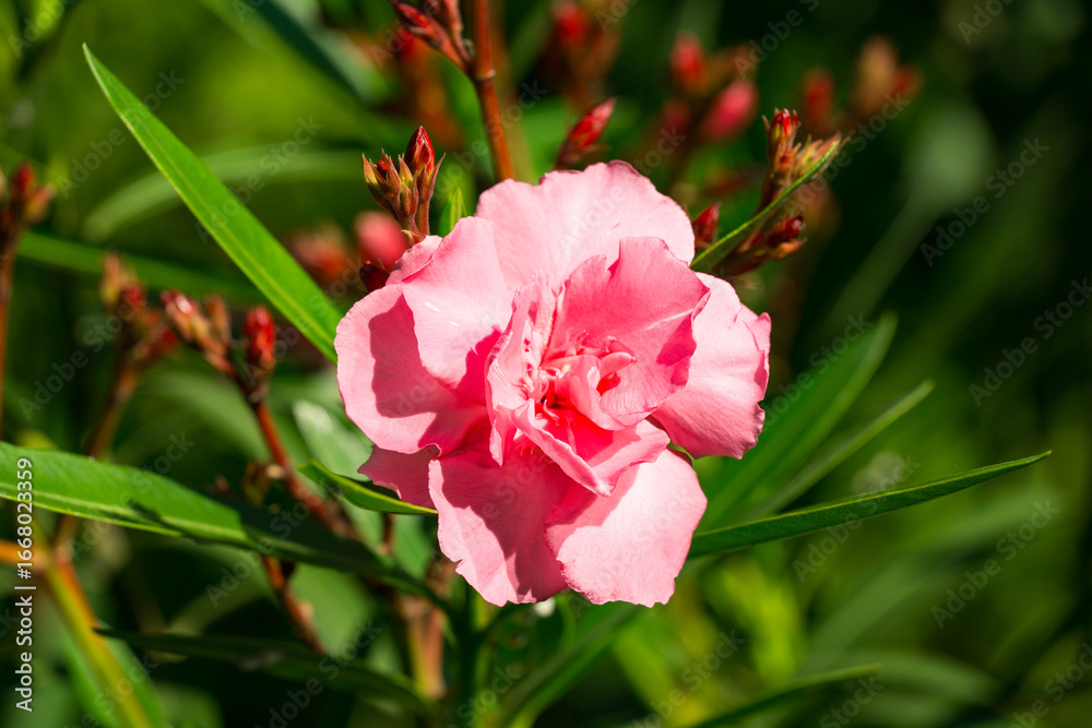 Delicate pink oleander (Nerium oleander) flower blooms beautifully, surrounded by slender green leaves and buds, basking in soft glow of sunlight