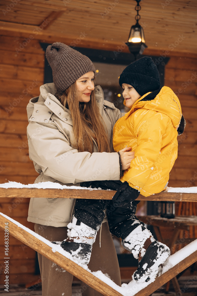mother and son spend holidays in a country house, winter season