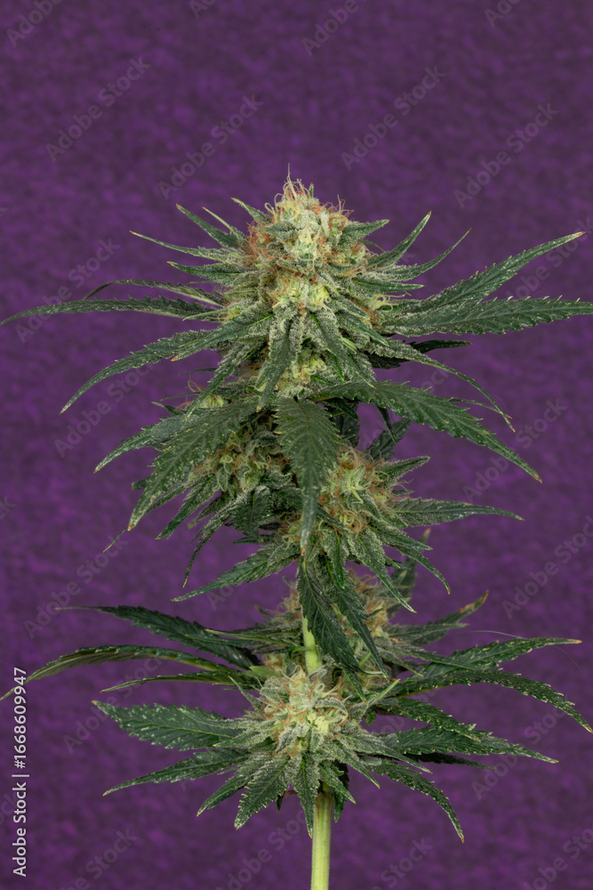 White widow variety of marijuana flower ripened bloom with violet wall