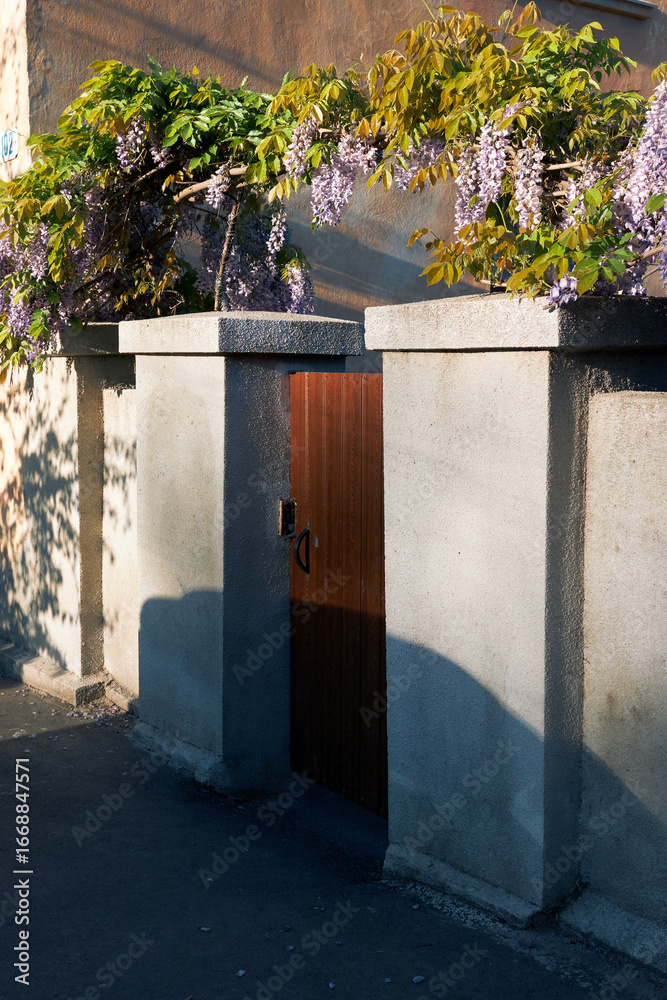 Wooden garden gate in concrete wall with blooming wisteria flowers above