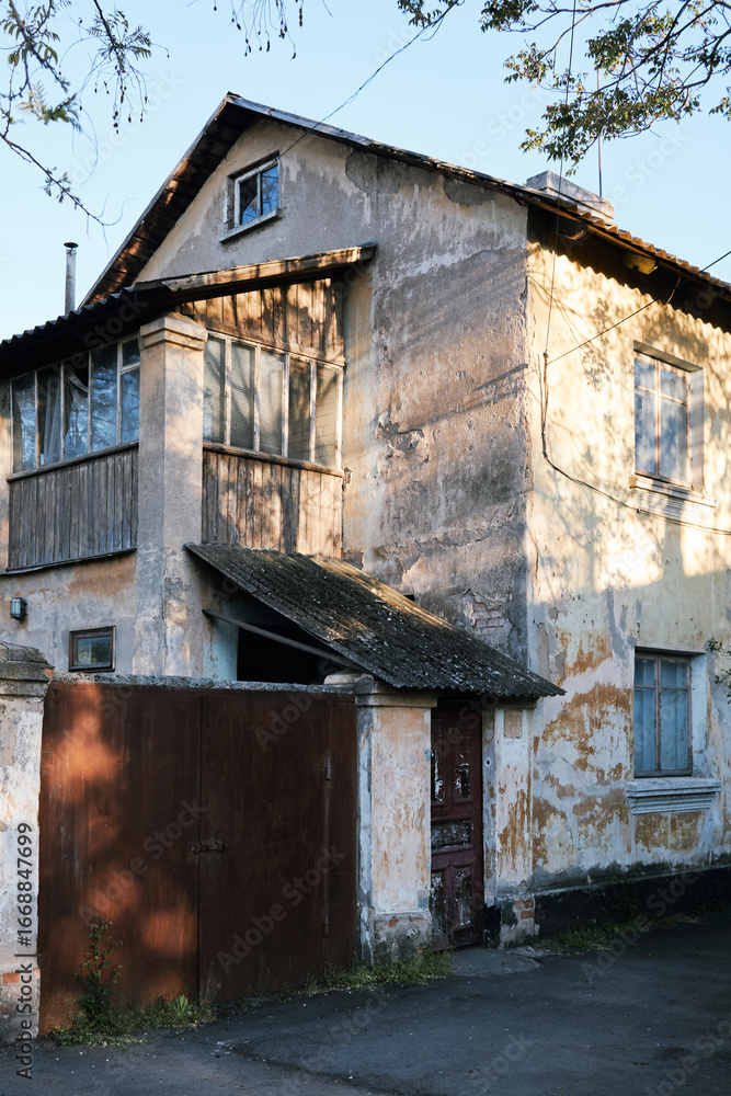 Old weathered two-story house with peeling plaster walls in evening sunlight