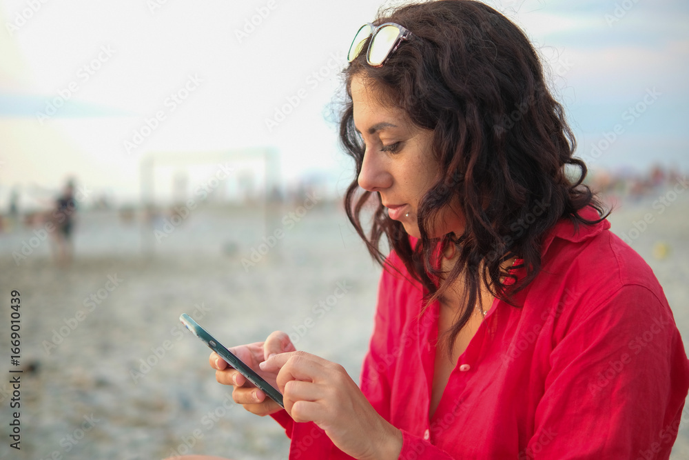 Beautiful brunette woman portrayed sitting on a wall while concentrated on her smartphone. The woman is thirty-eight years old and of Caucasian origin