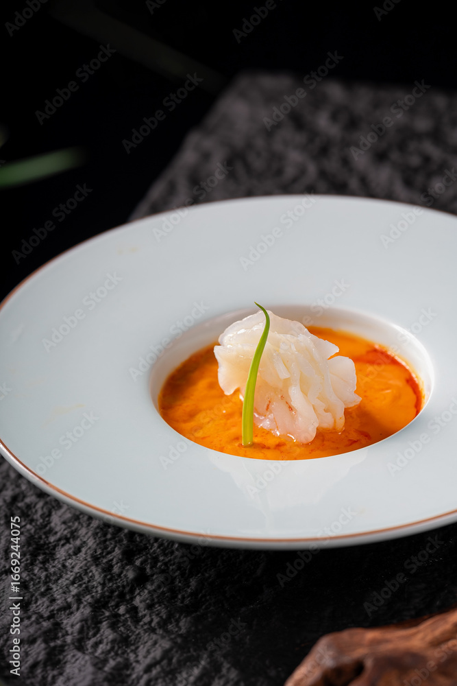 A delicious shrimp dish presented in a small bowl with orange sauce, garnished with a green herb.