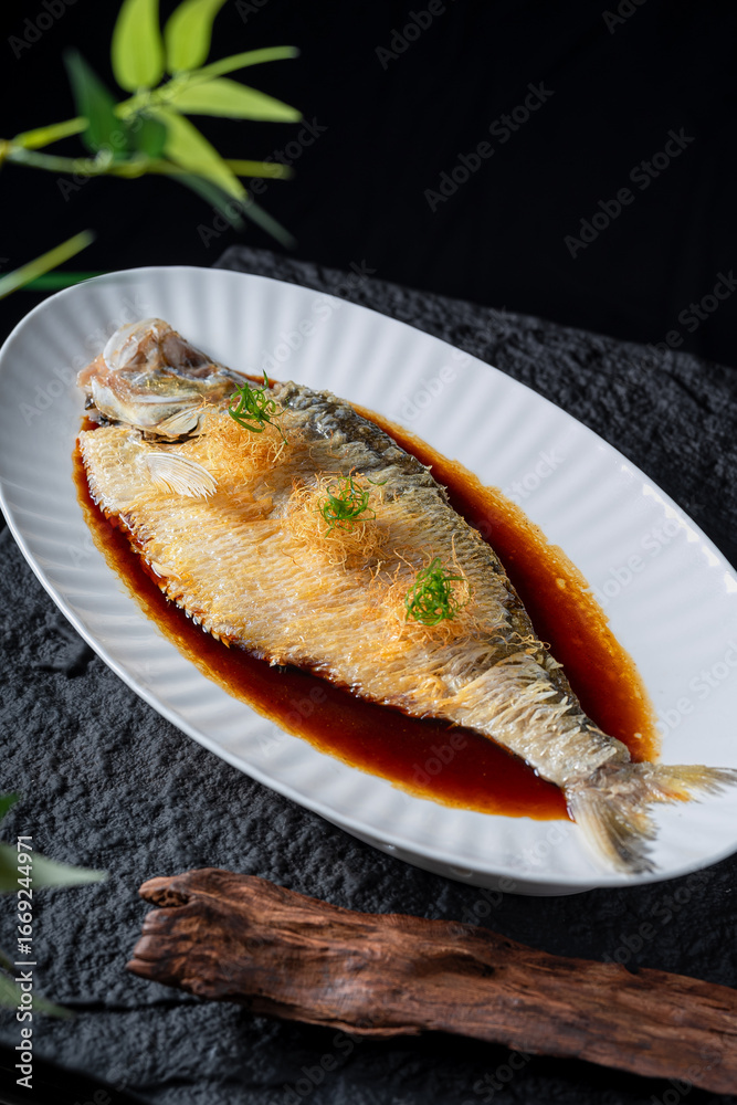 A plate of steamed fish with soy sauce, well-cooked and garnished with herbs, presented in an appetizing way.