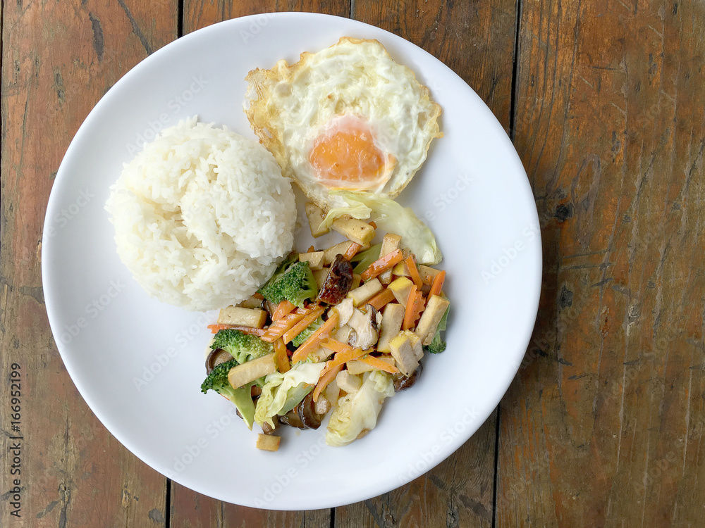 Stir Fried Tofu in Chinese Style, Deep Fried Tofu with Gravy Sauce ,Stir fried tofu with mixed vegetables and fried egg in white plate on white background. Vegetarian Food, healthy food.