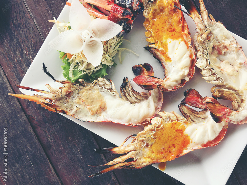 Delicious Grilled Giant River Prawn with pieces of chilli and parsley on white dish with soy sauce in small bowl in centre, on wooden table,view from above. Thai Style Food.