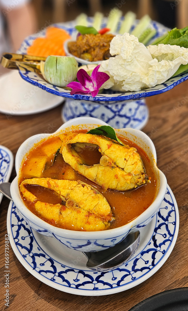 Thai spicy Sea bass fish with coconut shoot in yellow chili paste soup in Thai pattern plate