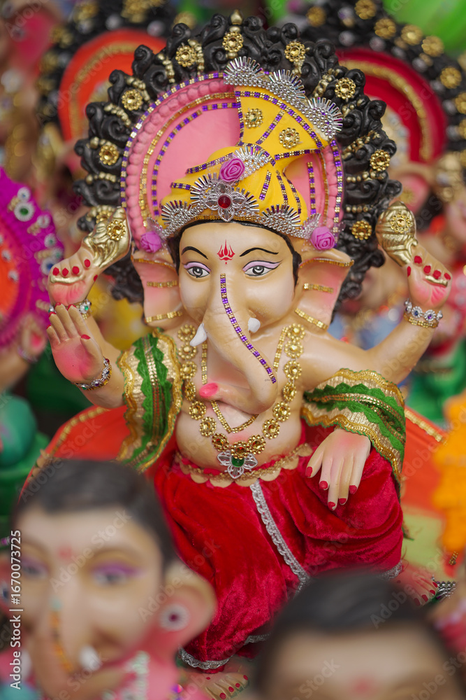 Lord Ganesha idol for Ganesh Chaturthi festival in India, Colorful Ganpati statue Stock Photo, Lord Ganesha murti.