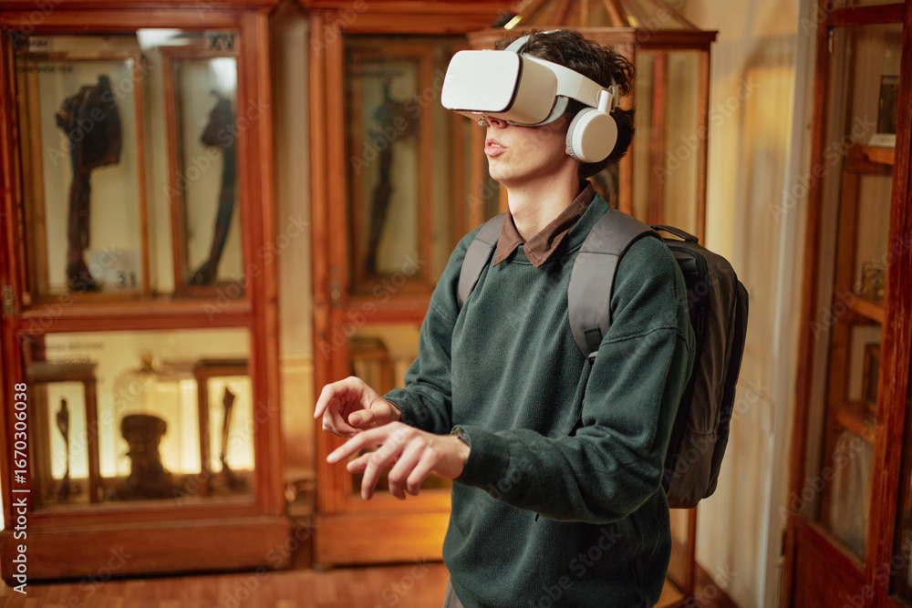 Caucasian young adult man wearing virtual reality headset interacting with digital content in museum setting, carrying backpack, standing with hands raised and fingers extended