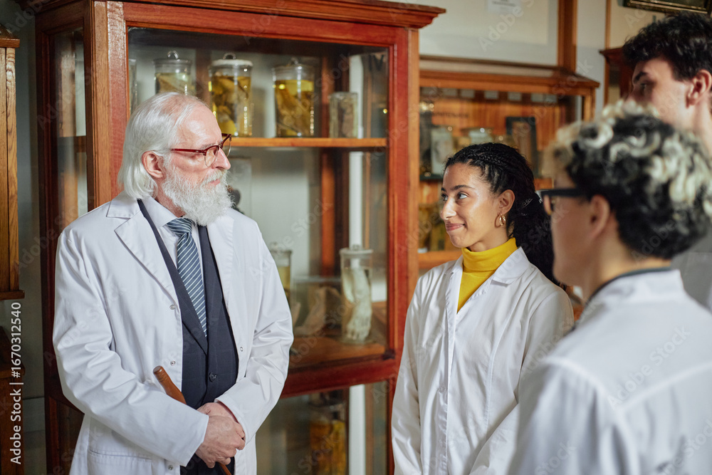 Senior Caucasian man with beard wearing lab coat instructing diverse group of young adult scientists in laboratory setting, students attentively listening to mentor