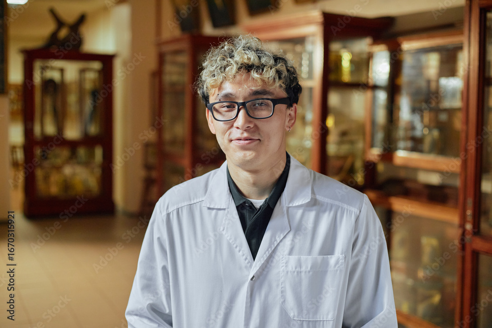 Portrait of young adult man with curly hair wearing eyeglasses and lab coat standing in museum or laboratory setting, smiling and looking at camera