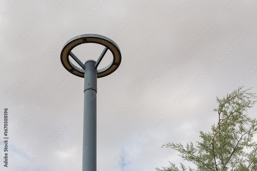 Modern street lamp on a pole. Circular shaped LED street lamp powered by solar energy.