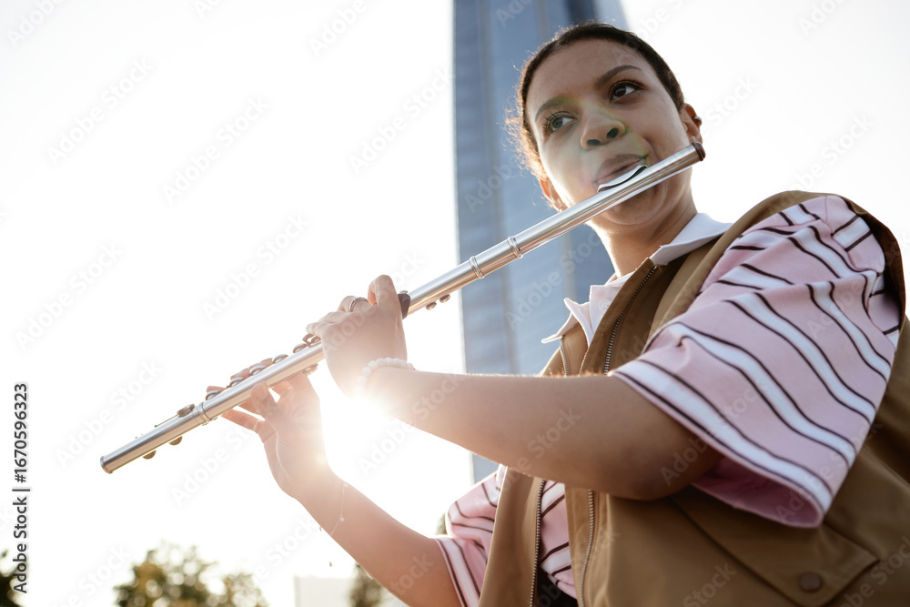 Woman playing flute outdoors with sunlight shining behind, standing in front of tall modern building, holding instrument with both hands, looking slightly upward