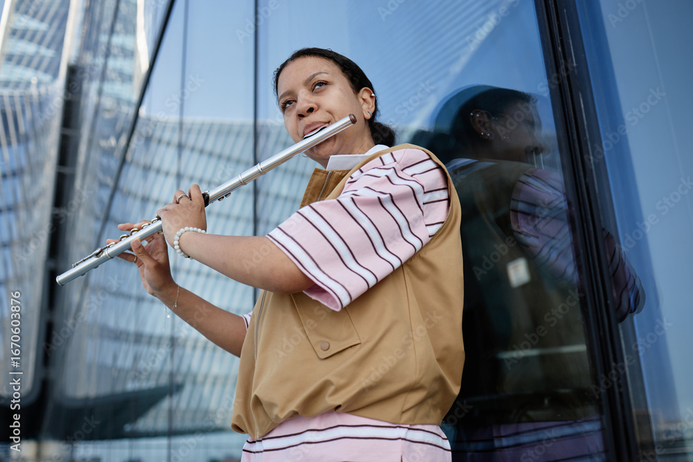 Young adult woman playing flute outdoors near modern glass building, holding instrument with both hands, looking slightly upward, wearing casual clothing, urban background visible