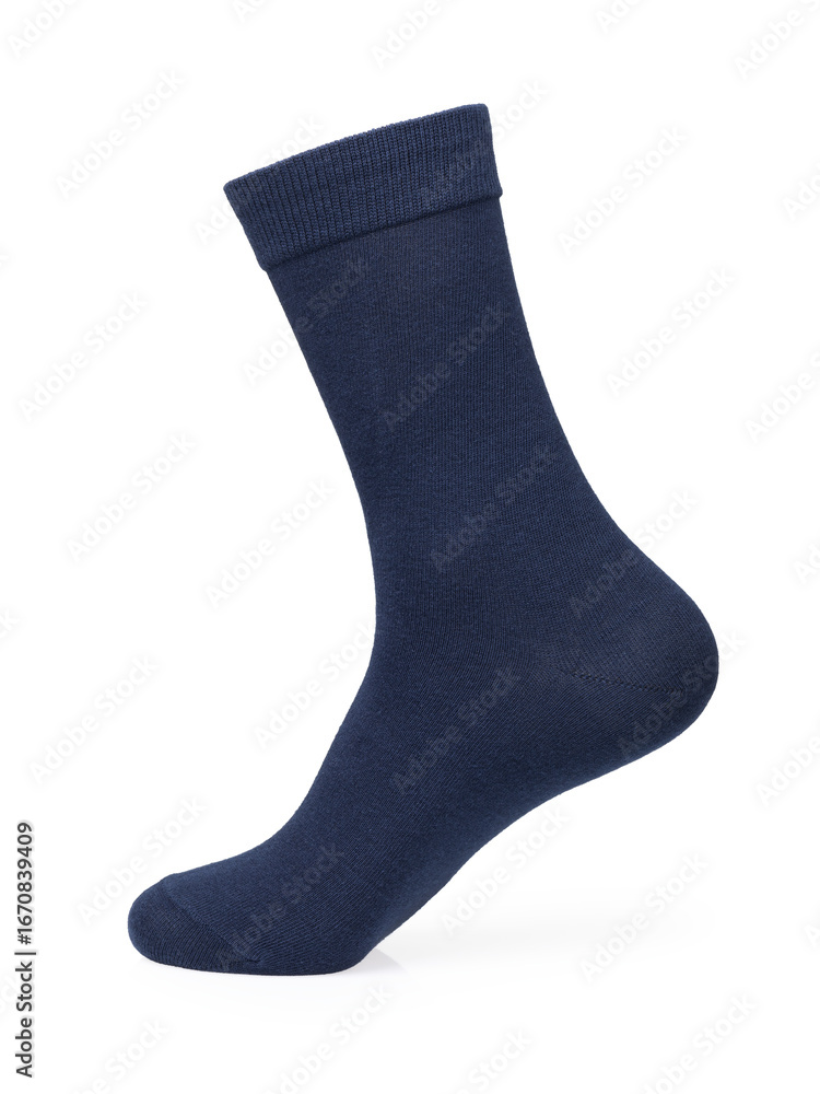 Dark blue classic sock on a mannequin isolated on white background, side view
