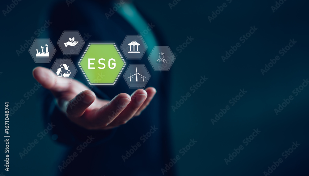 Businessman holding ESG icons including sustainability, renewable energy, recycling, governance, and social responsibility, symbolizing corporate ESG strategy and sustainable business development.