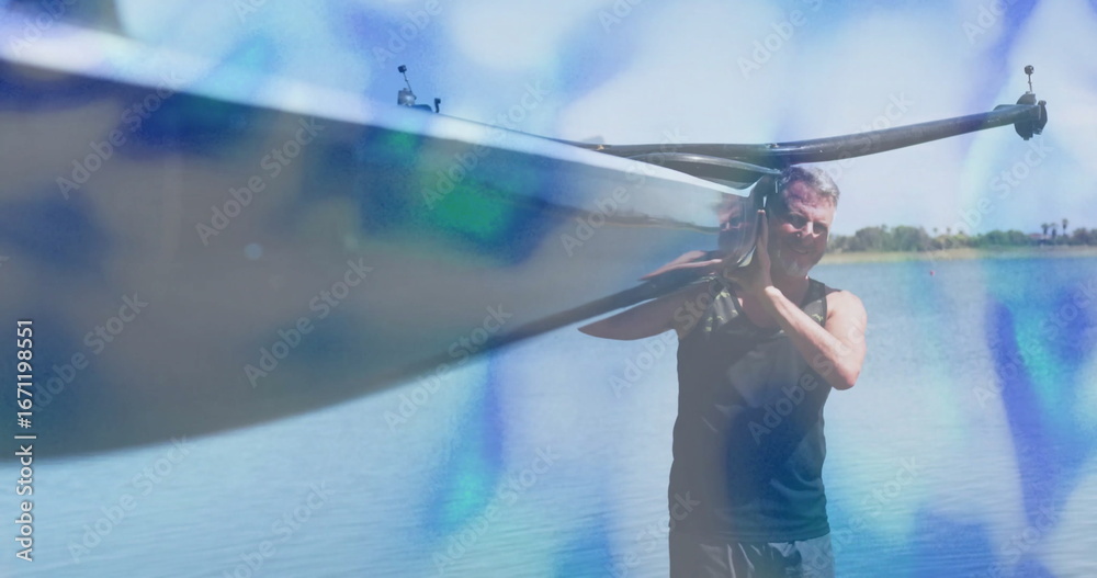 Holding senior athlete in dark top lifting white racing shell on shoulder at lakeshore copy space