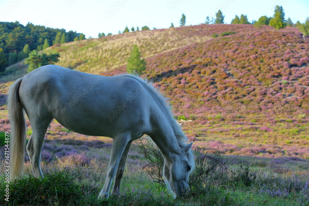 Colorful scenery with a wild white Icelandic horse and flowering heather in August on the hills of the National Park Veluwezoom, Rheden, Gelderland, Netherlands
