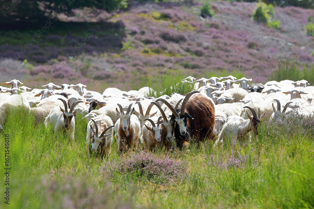 Colorful scenery with a sheep and goat herd and flowering heather in August on the hills of the National Park Veluwezoom, Rheden, Gelderland, Netherlands