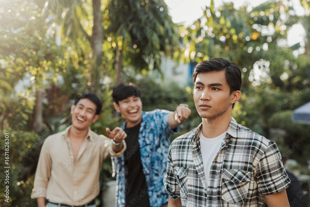 A solemn young Asian man tries to ignore two laughing bullies behind him as they continue mocking and name calling in public.