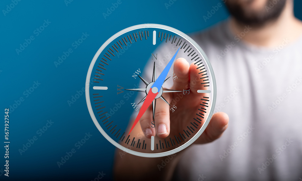 Conceptual image of a man using a digital compass to find direction and make strategic decisions.