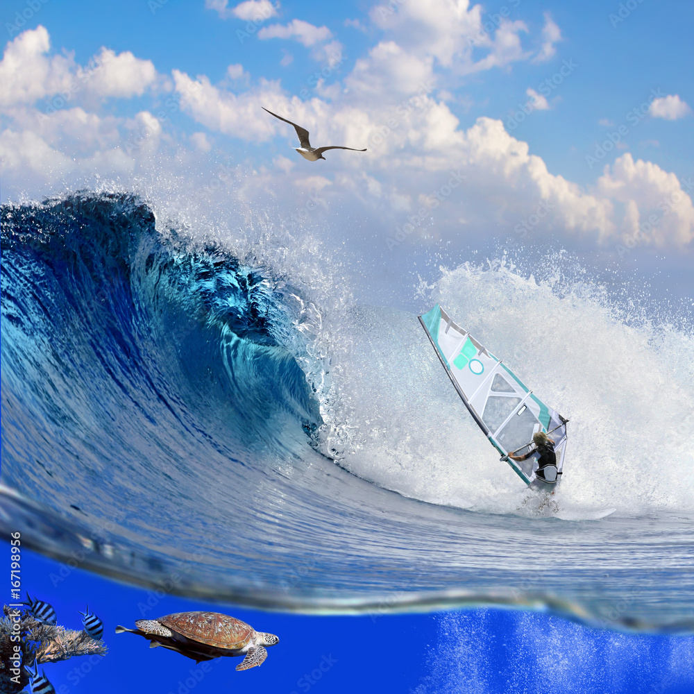 Separated image with waterline. Oceanview with breaking surfing wave and professional windsurfer on a board under sail and sealife with fish and tortoise swimming over coral reef