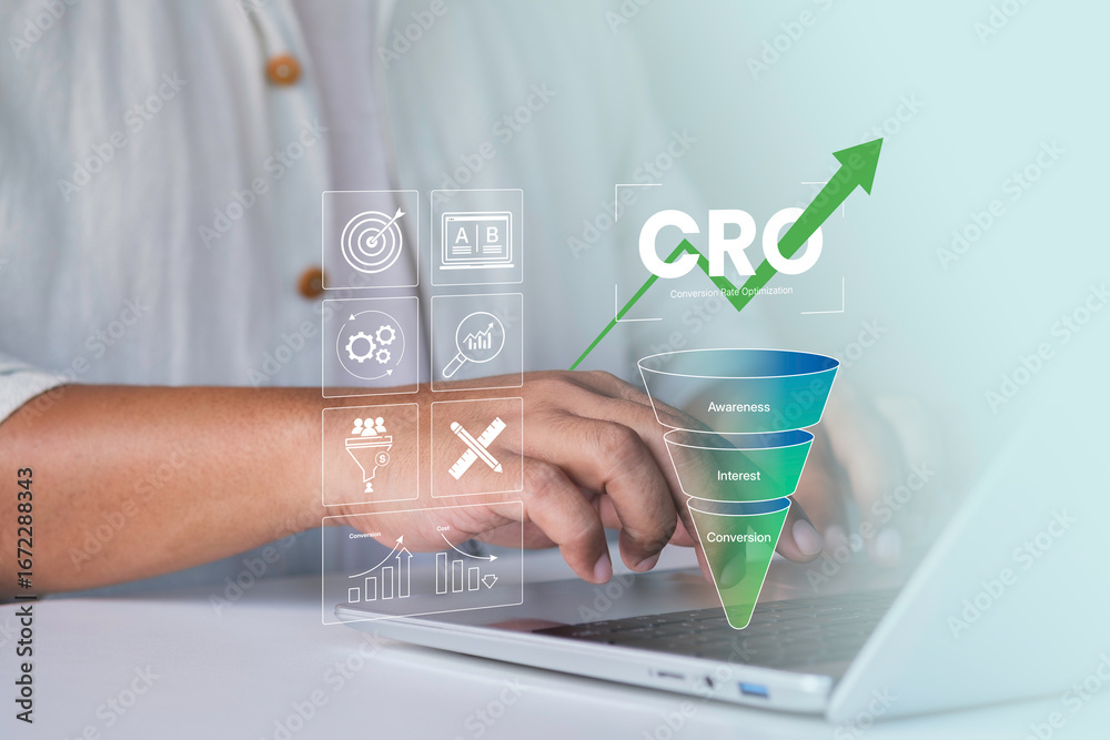 Conversion Rate Optimization, CRO success strategy, digital marketing funnel awareness interest conversion stages, business performance improvement, ROI growth, customer journey metrics visualization