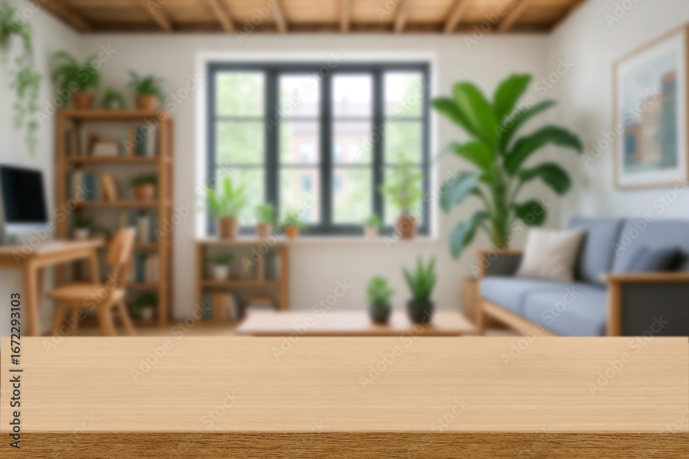 empty wooden table top blurred view of modern living room with sofa and soft bench. room interior with couch, armchair and coffee table or shelving units. stylish living room. comfortable workplace.