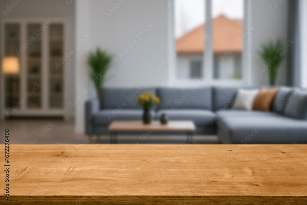 empty wooden table top blurred view of modern living room with sofa and soft bench. room interior with couch, armchair and coffee table or shelving units. stylish living room. comfortable workplace.