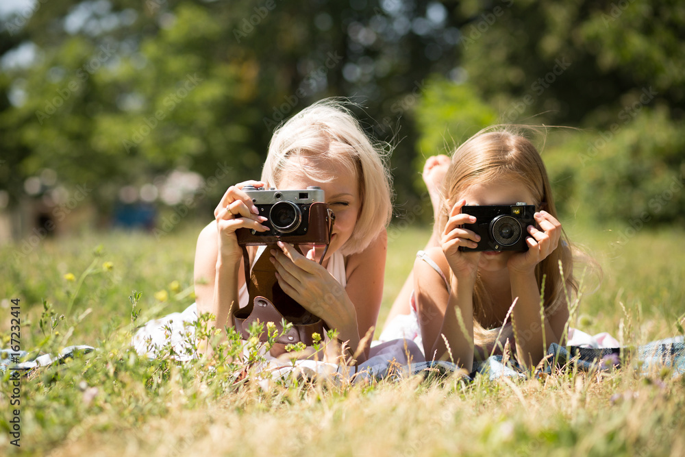 Mom and daughter taking pictures lying on blanket in park. Mother and child girl pretending to be photographers.