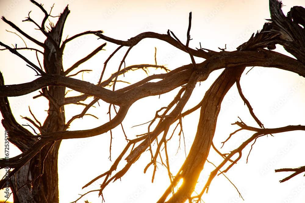 Silhouette of bare tree branches against a glowing sunset sky, symbolizing nature’s beauty and fragility