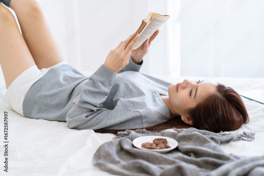 Relaxed Asian woman in casual outfit enjoying quiet time at home while reading book on bed. Cozy lifestyle concept with cookies, blanket, and peaceful modern living environment.
