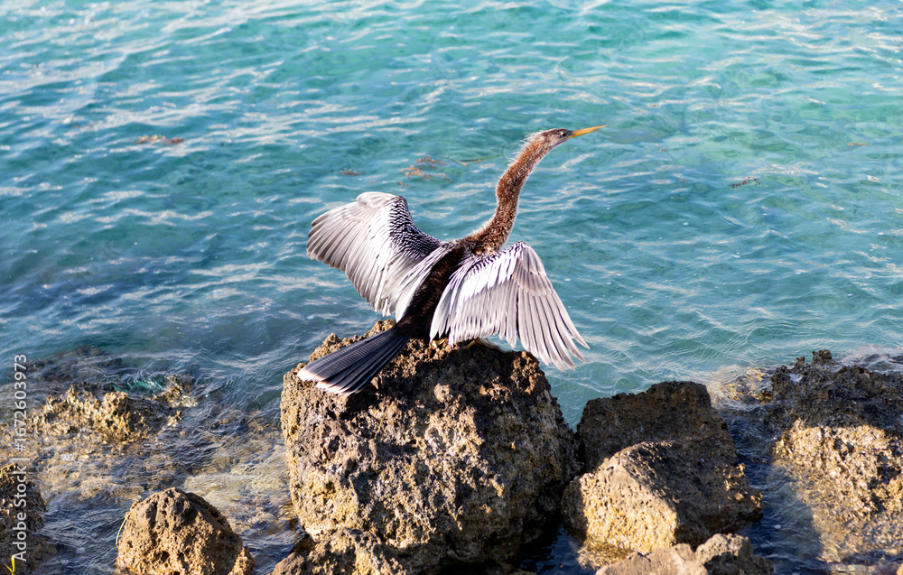 Snakebird near water. Sea darter bird. Fauna and nature. Snakebird observing the water. Sea bird with beak and feather. Anhinga sitting outdoor. A lonely anhinga at the sea