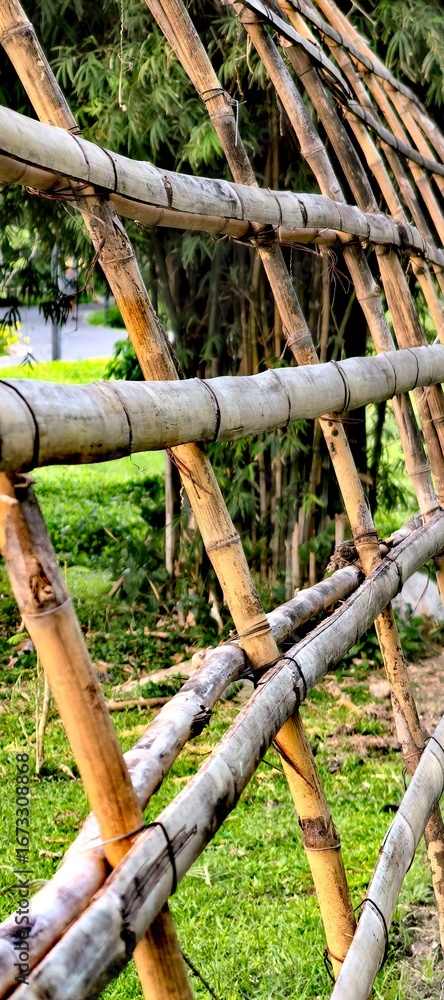 Close-up of a bamboo fence in a peaceful garden setting, creating a natural and rustic ambiance.