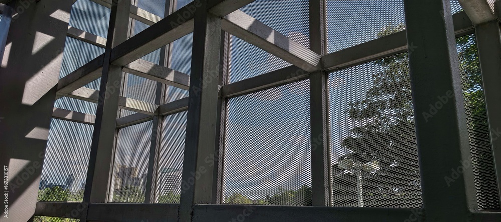 View of city buildings and sky through a metallic mesh screen, framed by architectural elements.