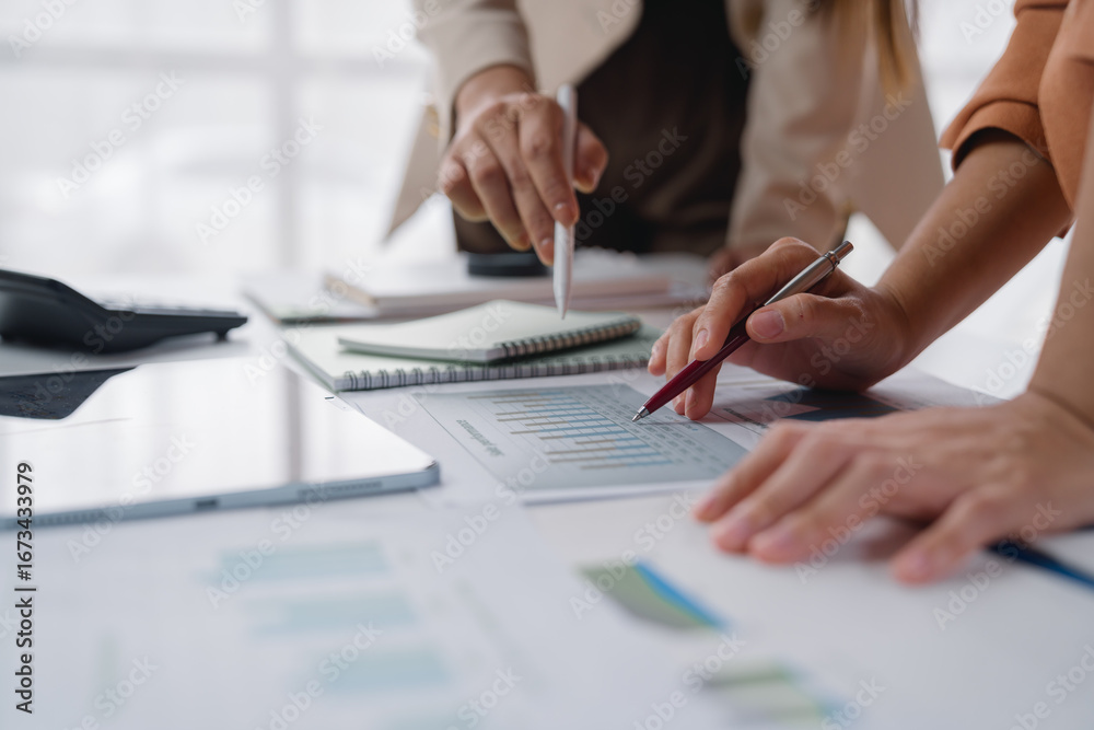 Business people collaborating in an office, analyzing financial charts and graphs with pens in hand. Utilizing calculators, tablets, and notebooks to strategize and plan for growth