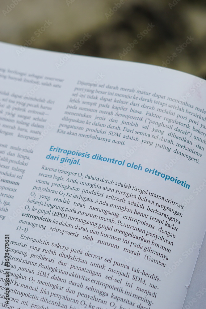 A close-up of an open medical textbook, showing detailed text and diagrams about human physiology and biology. This image represents study, education, research, and the journey of a medical student.