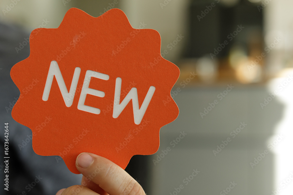 Close-up of a hand holding an orange sign that says NEW. Perfect for new product announcements.