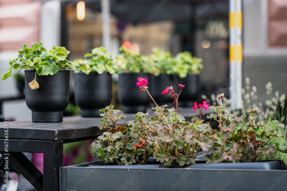 Arrangement of decorative plants in black pots on table outdoors, symbolizing home gardening, flower market, urban lifestyle, plant care and natural decoration for living spaces